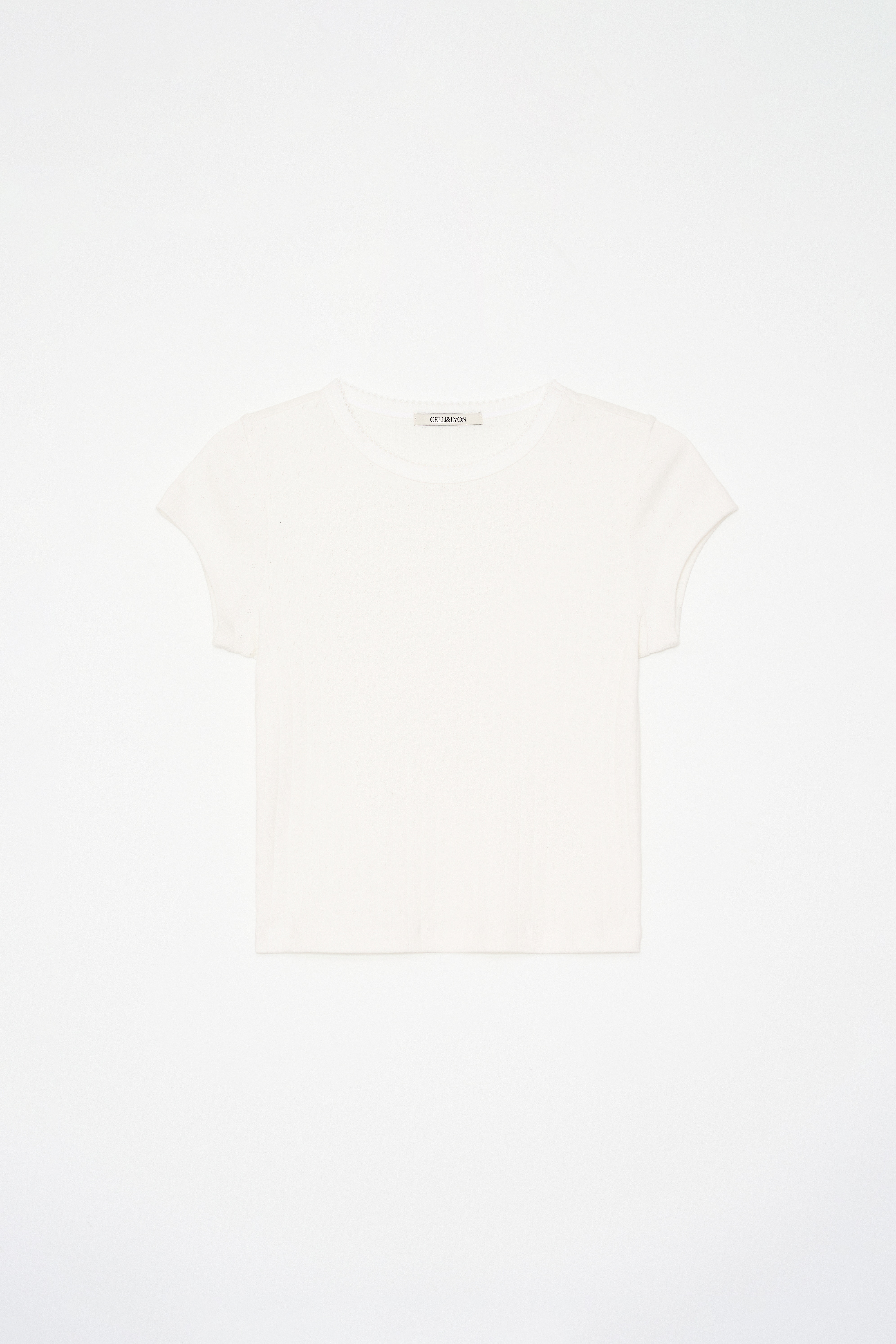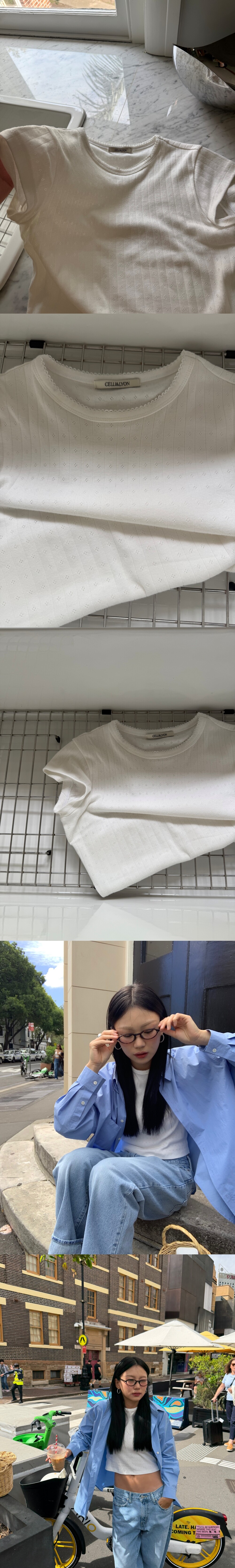 넥 라인에 귀여운 레이스가 달린 펀칭 크롭 티셔츠 입니다