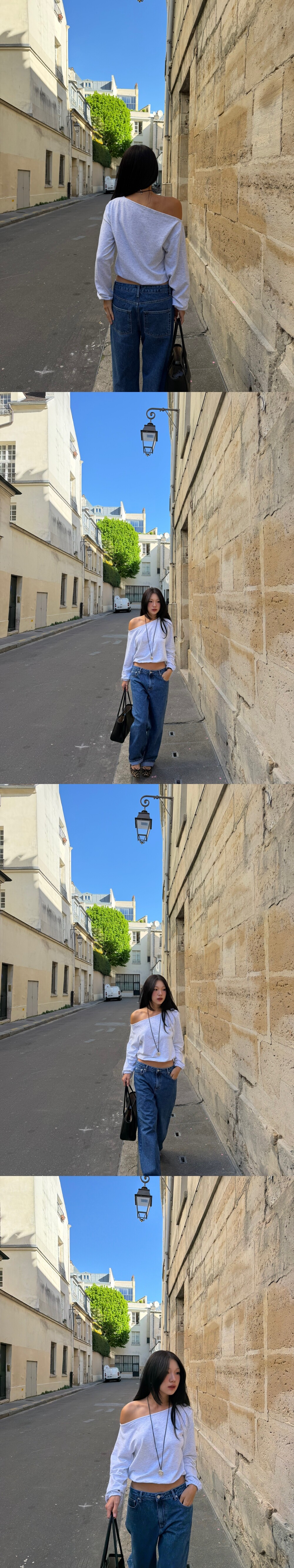 오른쪽으로 넥 파임이 있어 어깨 라인이 도드라지는 디자인이지만