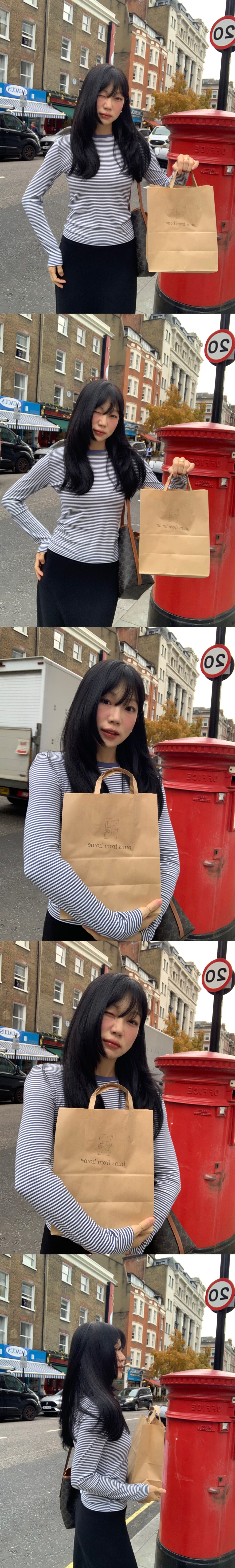 티셔츠 하나로 포인트가 됩니다 (아우터 착용시 손등에 떨어지는 잔 스트라이프 포인트)
