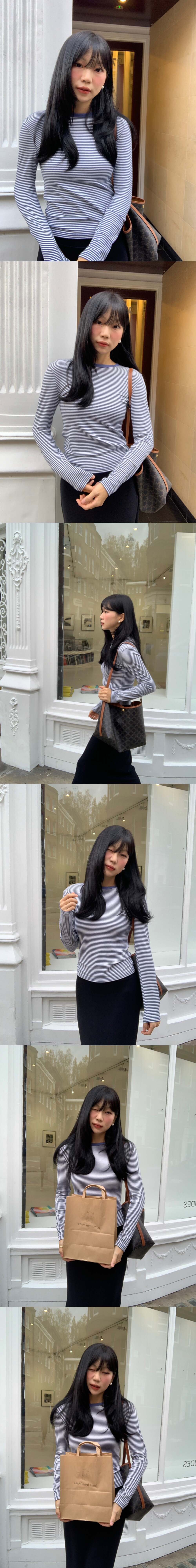 촉촉하면서 찰랑거리며 유연하게 몸을 감싸는 스트라이프 긴팔 티셔츠 입니다